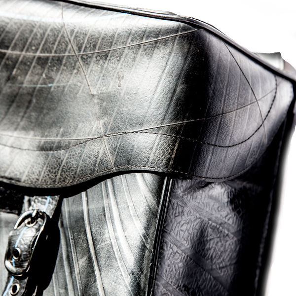 BOBBER are stylish, smart, mid-size saddlebags made from inner tube, cotton inner lining and some fake leather for re-enforcement.